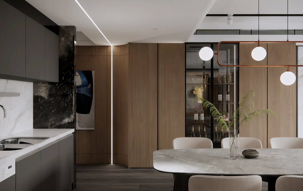 公領域敞亮開闊,私領域則透過精準的櫃體分割與燈光佈局,為屋主量身訂製專屬的「嗜好展演區」。